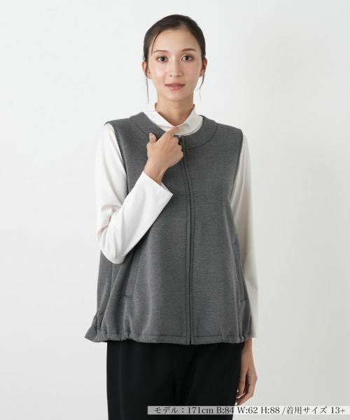 快適な着心地と美しいシルエットを両立する、ジャージータイプのベスト。ポリエステル、レーヨン、ポリウレタンをブレンドした素材は、しなやかな肌触りと優れたストレッチ性を特徴としています。ご自宅で手洗いできるウォッシャブル仕様で、日常のお手入れも簡単。前ジップで着脱しやすく、丸首デザインがすっきりと洗練された印象を与えます。シンプルな無地デザインなので、様々なインナーやボトムスと合わせやすく、着回し力も抜群です。秋の始まりには軽やかな羽織りとして、冬にはジャケットのインナーとして、長くご愛用いただけるでしょう。大人の女性の多様なライフスタイルに寄り添う、上質なアイテムです。