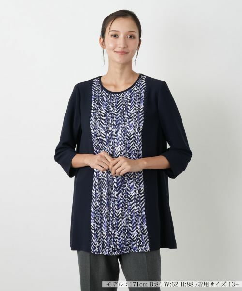 無地とプリント柄の切り替えデザインが目を引く、チュニックタイプのブラウス。高品質なポリエステル素材は、しわになりにくく、しなやかな肌触りが魅力です。ノーカラーの丸首と七分袖デザインが、洗練された大人の女性の品格を演出いたします。ご自宅で手洗いできるウォッシャブル仕様で、日常のお手入れも簡単。ヒップラインをカバーするチュニック丈は、スタイルアップ効果も期待でき、細身のパンツやレギンスと好相性です。同シリーズのブラウスと合わせてお召しいただくことも可能です。秋のデイリースタイルから、きれいめなお出かけまで、幅広いシーンで活躍する一枚です。