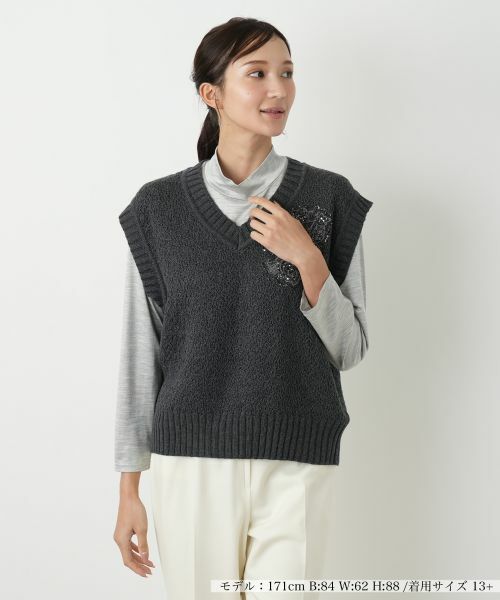 イタリアのニットファクトリーメーカー「CORSINI & PROTI」が手がける、上質で洗練されたVネックニットジレ。イタリア「ゼニアバルファ」社の上質な毛を100%使用した7ゲージの編地は、暖かく柔らかな肌触りです。特徴的な編み柄が個性を放ち、胸元に配されたレースアップリケが高級感を一層引き立てます。ニットの編地はもちろん、ハンドメイドならではの非常に繊細な刺繍が他にない物作りをしています。シャツやブラウス、薄手のニットなど、様々なインナーとレイヤードすることで、幅広いスタイルをお楽しみいただけます。季節の変わり目の羽織りとして、またコーディネートのアクセントとして活躍する魅力的な一枚です。