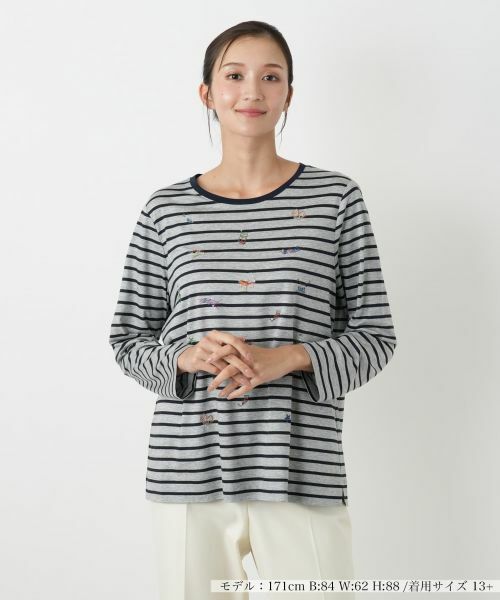 心地よい肌触りのボーダーTシャツ。再生繊維(セルロース)とコットンをブレンドした素材は、柔らかな風合いで日常に溶け込み、吸湿性にも優れています。上品なボーダー柄は、カジュアルながらも洗練された印象を与え、大人の女性にふさわしい一枚です。ご自宅で手洗いできるウォッシャブル仕様で、日常のお手入れも簡単。一枚で着ても、ジャケットやカーディガンのインナーとしても活躍し、幅広いスタイルにお召しいただけます。秋のデイリースタイルから、きれいめカジュアルまで、様々なシーンで活躍する汎用性の高い一枚です。