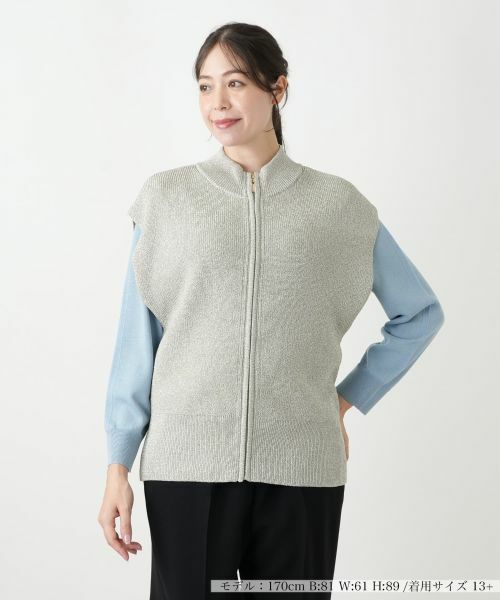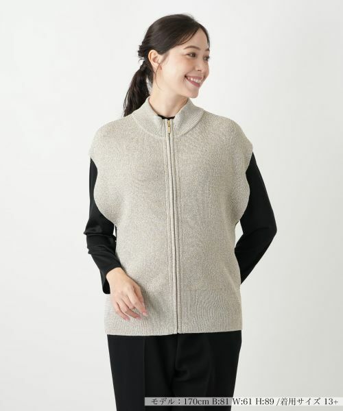 きめ細やかに編み込まれた生地からは、光の加減で微かな輝きが放たれ、装いに洗練された印象をもたらします。首元に沿うように立ち上がる襟と、フロントのジップアップデザインが、すっきりとシャープな印象を与えます。袖のないデザインは、様々なインナーとのレイヤードを可能にし、着こなしに広がりを持たせます。襟元や前立て、裾にあしらわれたリブ編みが、全体のシルエットに心地よい安定感と、細やかなディテールをプラスしています。