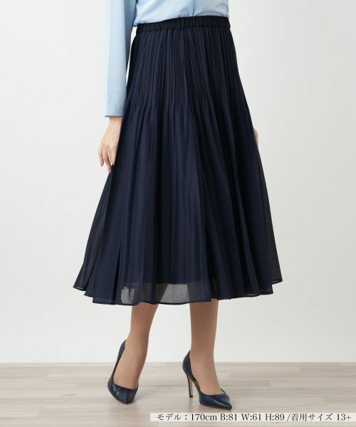 軽やかなオーガンジー素材を使用したプリーツスカート。ポリエステル独自の美しい光沢感と、透け感が魅力です。ウエスト下のプリーツから裾にかけてプリーツの形状が変化するデザインが特徴で、歩くたびに優雅な動きが生まれます。無地ながらも表情豊かな生地感で、様々なトップスと合わせやすい一枚。ウエストはゴム仕様で、快適な履き心地です。裏地付きで透け感を気にせず、安心してご着用いただけます。上品な透け感と美しいドレープが、装いを華やかに引き立てます。