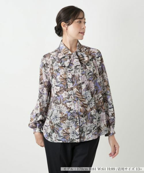 油絵のようなタッチのローズが描かれた、美しいプリントブラウス。ROCHASの今季テーマのひとつである冬の庭園を意識したデザインです。ラベンダーカラーが目を惹くフラワープリントは、細部にまでこだわった繊細な縁取りが施され、奥行きのある表情を生み出しています。襟元には共布のタイが付属しており、様々なアレンジをお楽しみいただけます。しわが目立ちにくいポリエステルデシン素材で、ご自宅で手洗いできるウォッシャブル仕様です。上品で華やかな一枚で、特別な日のお出かけはもちろん、普段の装いを格上げします。