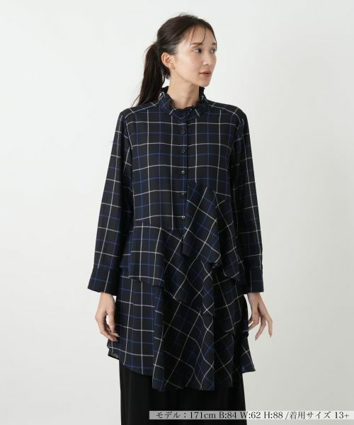 秋らしいチェック柄が目を引く、スタンドカラーブラウス。ポリエステルとレーヨンをブレンドした素材は、柔らかな肌触りと適度なハリ感を兼ね備えています。チェック生地をアシンメトリーに配したデザインが、モダンで洗練された印象を与えます。スタンドカラーと長袖のデザインが、大人の女性の品格を一層引き立てます。ご自宅で手洗いできるウォッシャブル仕様で、日常のお手入れも簡単。一枚で着ても華やかな存在感を放ち、ジャケットやカーディガンのインナーとしても上品に映えます。秋のコーディネートに上品さと個性を添える、着回し力の高い一枚です。