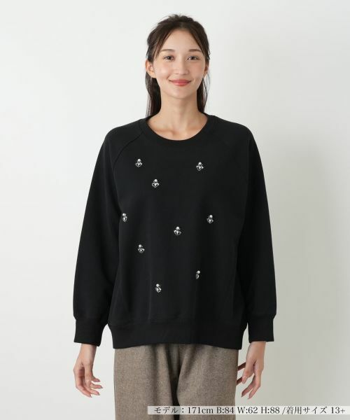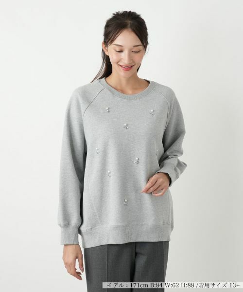輝きのある装飾が胸元を彩る、上品なトレーナー。コットン100%の上質な素材は、柔らかな肌触りと快適な着心地が魅力です。ご自宅で手洗いできるウォッシャブル仕様で、日常のお手入れも簡単。シンプルな丸首と長袖のデザインは、カジュアルながらも洗練された印象を与え、大人の女性にふさわしい一枚です。リブ地にはコットンとポリウレタンをブレンドし、フィット感を高めています。一枚で着ても、インナーとしても上品に映える、着回し力の高いアイテムです。秋のデイリースタイルから、きれいめカジュアルまで、幅広いシーンで活躍する汎用性の高い一枚です。