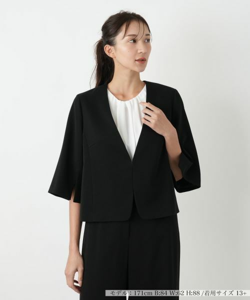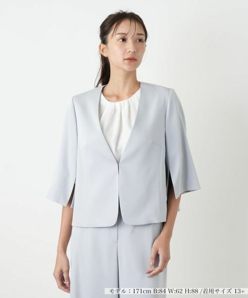 しわが目立ちにくい素材で仕立てた、上品なVネックジャケット。トリアセテートとポリエステルの薄手ダブルクロス素材は、適度なふくらみ感とストレッチ性が特徴で、美しさと快適さを両立します。ノーカラーのVネックデザインは、デコルテラインをすっきりと見せ、洗練された印象を与えます。同シリーズのパンツとセットアップとしてもお召しいただけ、オフィスシーンからお食事会まで、幅広い場面で活躍する汎用性の高い一枚です。秋のコーディネートに品格と快適さを添える、こだわりのアイテムです。