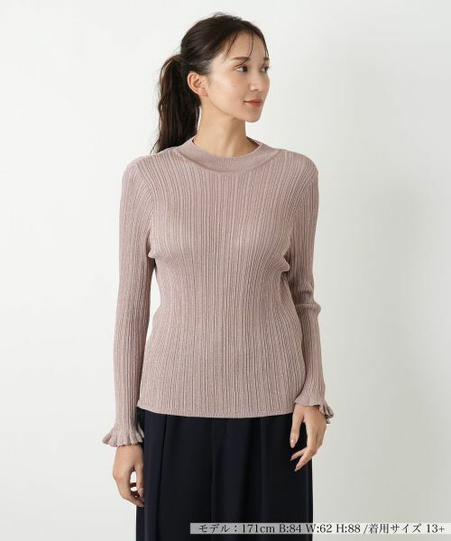 プレーティング編みのラメニットが上品に輝くボトルネックセーター。秋の装いを華やかに彩る、洗練された無地デザインです。ラメ糸が表側のみに出るように編み込まれているため、肌に直接当たることがなく、快適な着心地をお楽しみいただけます。適度にゆとりのあるランダムリブが身体に程よくフィットし、ハイネックは首元を優しく包み込みます。同シリーズのカーディガンと合わせれば、統一感のあるラメニットアンサンブルが完成。特別な日のお出かけはもちろん、普段の装いを格上げする一枚として、大人の女性のエレガンスを演出いたします。