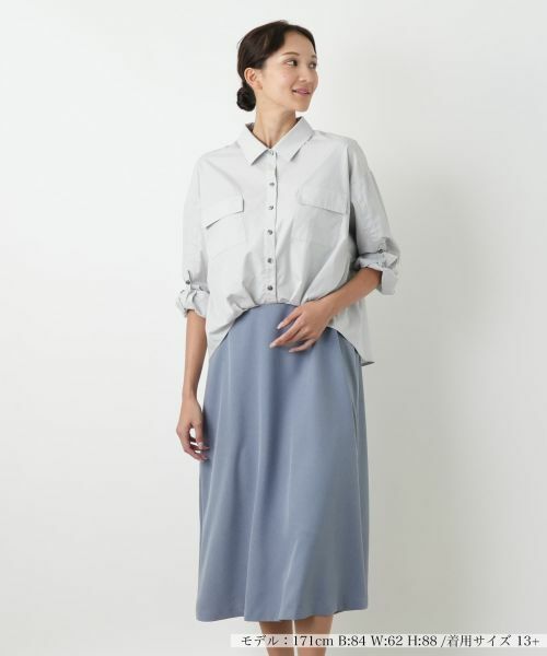 シャツブラウスとフレアスカートをセットで着たような、ドッキングデザインのワンピースです。一枚でサマになる便利アイテム。シャツ部分はハリのあるブロード素材、スカート部分はふくらみ感のあるツイル素材を使用。ウエスト周りがすっきりとおさまります。