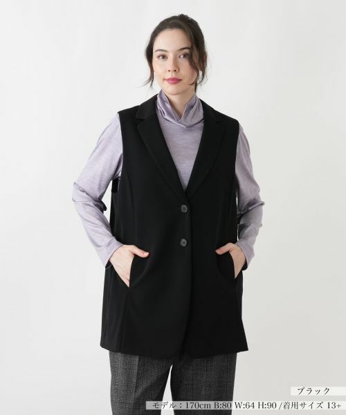 快適な着心地と美しいシルエットを両立する、ベスト。ポリエステルを主体とした素材にポリウレタンを混紡することで、程よいストレッチ性を実現いたしました。ご自宅で手洗いできるウォッシャブル仕様で、日常のお手入れも簡単。クラシカルなノッチドラペルデザインが、洗練された大人の女性の品格を演出いたします。シンプルな無地デザインなので、様々なインナーやボトムスと合わせやすく、着回し力も抜群です。秋の始まりには軽やかな羽織りとして、冬にはジャケットのインナーとして、長くご愛用いただけるでしょう。大人の女性の多様なライフスタイルに寄り添う、上質なアイテムです。