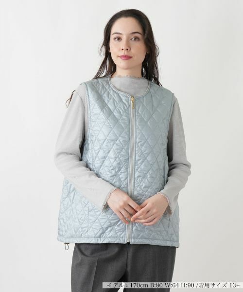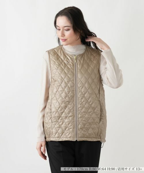 暖かな中わた入りベストは、肌寒い季節に重宝するアイテム。軽やかなナイロン素材は、上品な光沢感と滑らかな肌触りが特徴です。ノーカラーの丸首デザインが、すっきりと洗練された印象を与え、様々なインナーとのレイヤードをお楽しみいただけます。インナーベストとしても便利で、秋口から冬まで長くご活用いただけます。シンプルな無地デザインなので、様々なトップスやボトムスと合わせやすく、着回し力も抜群です。大人の女性の多様なライフスタイルに寄り添う、機能性とデザイン性を兼ね備えた一枚です。