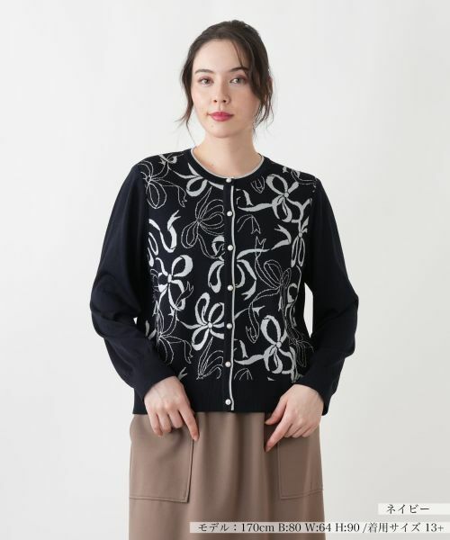 クラシカルなクルーネックに、リボンとフラワーモチーフの柄が華やかな印象を与えるカーディガンです。緻密に編み込まれた柄は、立体感があり、上品な雰囲気。襟元と前立てのパイピングがデザインを引き締め、アクセントになっています。パール調のボタンが、さらにエレガントさをプラス。薄手のニット素材は、季節の変わり目の羽織りとして最適で、ワンピースやスカートスタイルに合わせれば、フェミニンな装いを完成させます。シンプルなボトムスと合わせるだけで、着映えする一枚です。