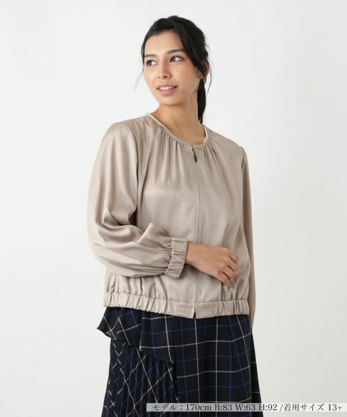 微細なサテンの光沢が上品な、ノーカラーブルゾン。アセテート100%の素材は、しなやかな落ち感が特徴で、優雅なドレープを生み出し、洗練された印象を与えます。袖部分には伸縮性があり、腕を捲し上げやすい快適な仕様。シンプルな無地デザインなので、様々なトップスやボトムスと合わせやすく、着回し力も抜群な一枚です。秋のデイリースタイルから、きれいめカジュアルまで、幅広いシーンで活躍する汎用性の高い一枚です。軽やかな羽織り心地で、季節の変わり目から重宝します。