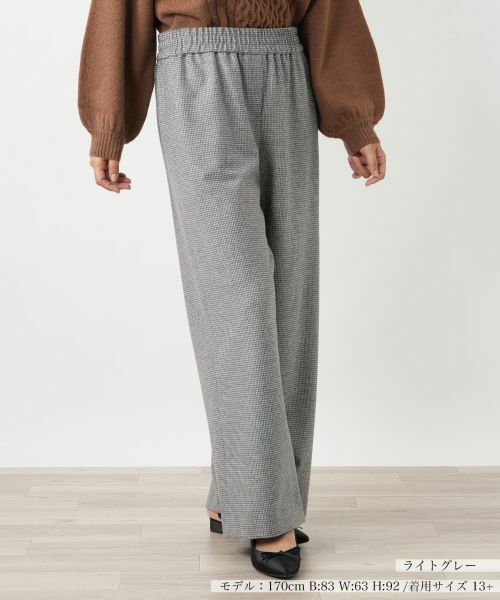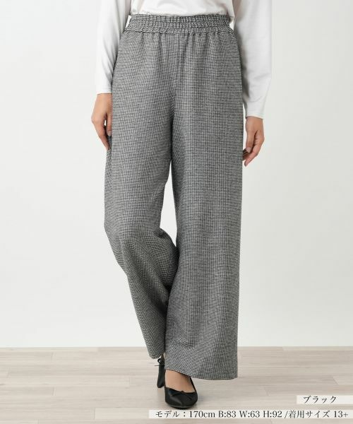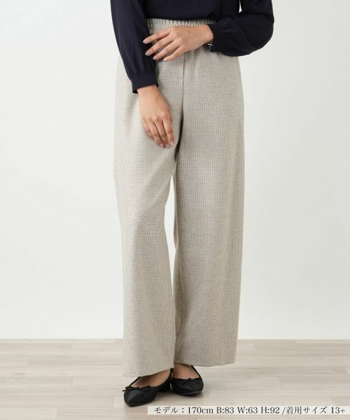 毛を主体とした素材にポリエステル、レーヨン、ナイロン、ポリウレタンをブレンドした、暖かく快適なワイドパンツ。しなやかな肌触りと優れたストレッチ性で、長時間の着用でもストレスフリーです。ゆったりと広がるワイドシルエットは、脚のラインを拾いすぎず、優雅な動きを演出。ウエストはゴム入りで、窮屈感なくフィットします。裏地付きで、安心してご着用いただけます。秋のデイリースタイルから、きれいめなオフィススタイルまで幅広くお楽しみいただける一本です。