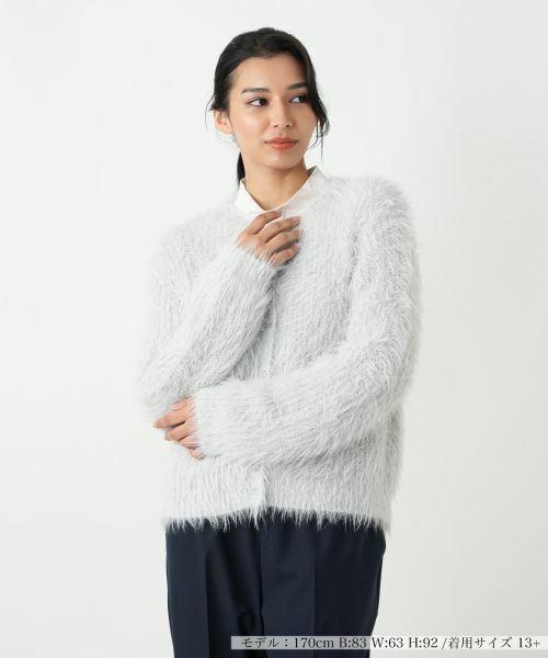 ふわふわとしたシャギー素材が特徴のカーディガンです。毛足の長い柔らかな質感が、見た目にも暖かく、フェミニンな印象を与えます。シンプルなクルーネックデザインで、ブラウスやカットソーなど様々なインナーと合わせやすい一枚です。ゆったりとしたシルエットで着心地も良く、羽織るだけで季節感のあるコーディネートが完成します。デイリー使いから、ちょっとしたお出かけまで、幅広いシーンで活躍します。