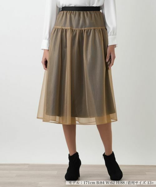 エアリーなトリコット素材とサテン裏地を重ねた、光沢感が華やかなスカート。ポリエステルを主体とした素材は、しわが目立ちにくく、美しいドレープ感が魅力です。ウエスト下はすっきりとさせて、中ヒップに切り替えとギャザーを入れることで、ふんわりとした優雅なシルエットを演出。ウエストはゴム仕様で、快適な穿き心地ながらも、見た目の美しさを損ないません。冬の装いを華やかに彩る、洗練された一枚です。特別な日のお出かけはもちろん、普段の装いを格上げする一枚としてご活用いただけます。