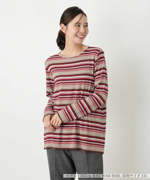 イタリアの「BIANCA LANCIA」による、上品で洗練されたボーダー柄カットソー。レーヨンとポリウレタンをブレンドした素材は、しなやかな肌触りと快適なストレッチ性を特徴とし、インポートならではの編地の美しさが魅力です。丸首デザインがデコルテラインを美しく見せ、アクセサリーも引き立てます。ご自宅で手洗いできるウォッシャブル仕様で、日常のお手入れも簡単。一枚で着ても、インナーとしても上品に映える、大人の女性のための着回し力の高いアイテムです。