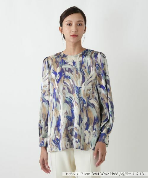 ポリエステル100%で仕立てた、しなやかな肌触りの柄ブラウス。美しいドレープ感が特徴で、女性らしい優雅な動きを演出します。ご自宅で手洗いできるウォッシャブル仕様で、日常のお手入れも簡単。ノーカラーの丸首デザインがデコルテラインを美しく見せ、アクセサリーも引き立てます。一枚で着るだけで華やかな存在感を放ち、特別な日のお出かけはもちろん、普段の装いを格上げする一枚としてご活用いただけます。