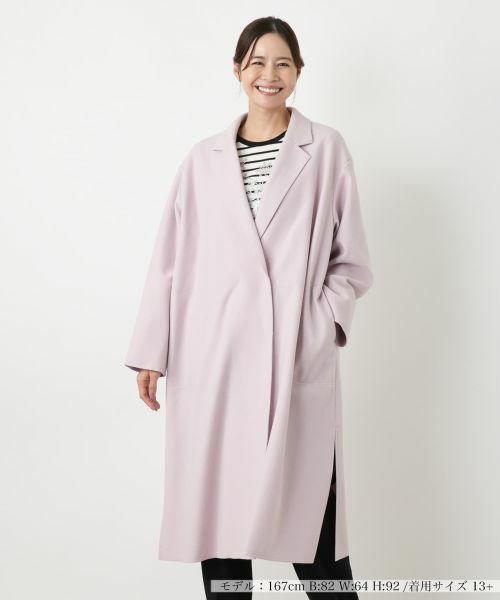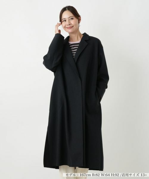しっとりとした落ち感のある素材が特徴のロングコートです。テーラードカラーのきちんと感と、ゆったりとしたシルエットが、リラックスした大人の上品さを演出します。フロントはオープンデザインで、ラフに羽織るだけでこなれた印象に。両サイドには、大きめのパッチポケットが配されており、デザイン性と実用性を兼ね備えています。サイドに入った深めのスリットが、足さばきを良くし、軽やかな動きをプラス。季節の変わり目のライトアウターとして、またコーディネートの主役としても活躍する一枚です。