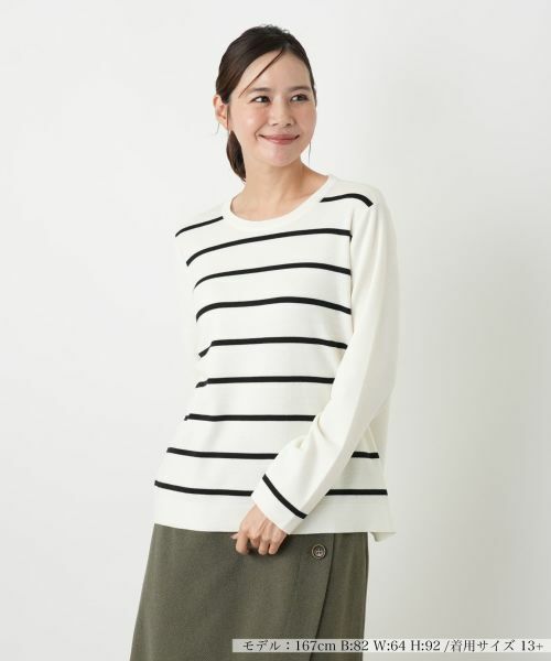 毛100%で仕立てた、暖かく柔らかな肌触りのセーター。シンプルなボーダー柄デザインは、どんなボトムスや羽織りとも合わせやすく、上品さを保ちながら幅広いコーディネートにお楽しみいただけます。ノーカラーの丸首デザインが、デコルテラインを美しく見せ、アクセサリーも引き立てます。一枚で着ても、インナーとしても上品に映える、大人の女性のための着回し力の高いアイテムです。秋のデイリースタイルから、きれいめカジュアルまで、様々なシーンで活躍する汎用性の高い一枚です。