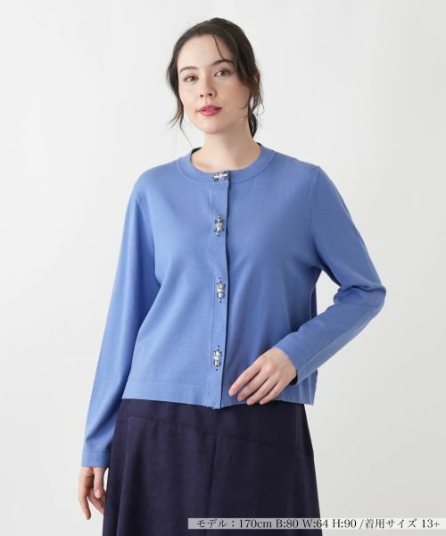 ------------------------------------着用シーズン:秋 伸縮性:あり透け感:なしポケット:なし生地の厚さ:やや薄手-------------------------------------レーヨンとポリエステルをブレンドしたしなやかな糸で編み立てた、ショート丈カーディガン。ワンピースやスカートスタイルにお薦めのバランスで、繊細なビジューパーツがフロントに配されています。さりげない輝きが魅力で、シンプルなスタイルに羽織るだけでエレガントな印象に。秋の始まりに軽やかに羽織れる一枚として重宝します。大人の女性の日常を華やかに彩る、着回し力の高いアイテムです。※商品の色味は、撮影場所や光のあたり具合、お客様のお使いの機器により色味が違って見える場合がございます。予めご了承ください。家庭洗濯不可漂白不可タンブル乾燥不可アイロン低温160℃まで石油系溶剤ドライクリーニング弱ウェットクリーニング不可