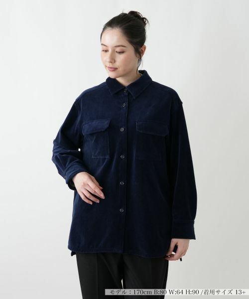 コーデュロイ素材のシャツブラウス。コットンを主体にポリエステルとポリウレタンをブレンドした素材は、柔らかな肌触りとストレッチ性を兼ね備え、快適な着心地です。ご自宅で手洗いできるウォッシャブル仕様で、日常のお手入れも簡単。シャツカラーと長袖のデザインが、カジュアルながらも洗練された大人の印象を与えます。シンプルな無地デザインなので、様々なボトムスと合わせやすく、着回し力も抜群です。秋のデイリースタイルに、温もりとこなれ感をプラスする汎用性の高い一枚です。
