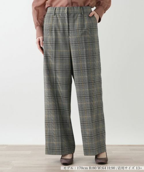 クラシカルなチェック柄が目を引くワイドパンツです。落ち着いた配色に、細かな格子柄が知的で上品な印象を与えます。ウエストはゴム仕様で、リラックス感のある穿き心地。フロントのタックが腰回りにゆとりを持たせつつ、すとんと落ちるワイドシルエットが脚を長く美しく見せます。トップスを選ばない汎用性の高さで、ブラウスと合わせてきれいめに、ニットと合わせてカジュアルにと、様々なスタイルにマッチ。オフィスシーンから普段使いまで、幅広い場面で活躍する一本です。