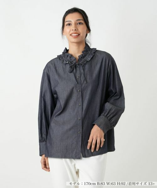 コットン100%のライトオンスインディゴデニムシャツ。特殊な「SUPER ZERO」撚糸を使用し、通常のデニムにはない軽さとふっくらとした風合い、ソフトな肌触りを実現しました。ゆったりとしたリラックス感のある身幅と肩幅に加え、リボン付きのギャザー衿がデザインのポイント。ギャザーフリルは、フリルの幅や分量まで計算し、大人向けに仕立てました。ご自宅で手洗いできるウォッシャブル仕様で、日常のお手入れも簡単です。秋のカジュアルスタイルを洗練された印象に格上げする一枚です。