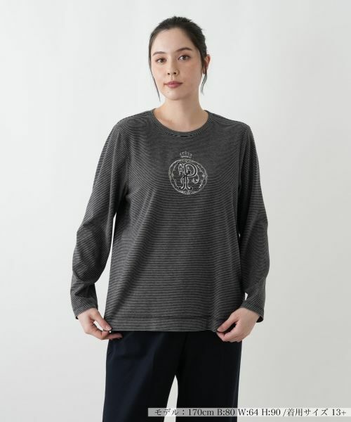 胸元中央にラメ刺繍が施された、ワンポイントが光るボーダーカットソー。アクリル、レーヨン、ポリウレタンをブレンドした素材は、暖かく柔らかな肌触りと快適なストレッチ性を特徴としています。ご自宅で手洗いできるウォッシャブル仕様で、日常のお手入れも簡単。丸首デザインが、デコルテラインをすっきりと見せ、アクセサリーも引き立てます。一枚で着ても、インナーとしても上品に映える、大人の女性のための着回し力の高いアイテムです。秋のコーディネートに軽やかなアクセントを添える、心地よさとデザイン性を兼ね備えた一枚です。