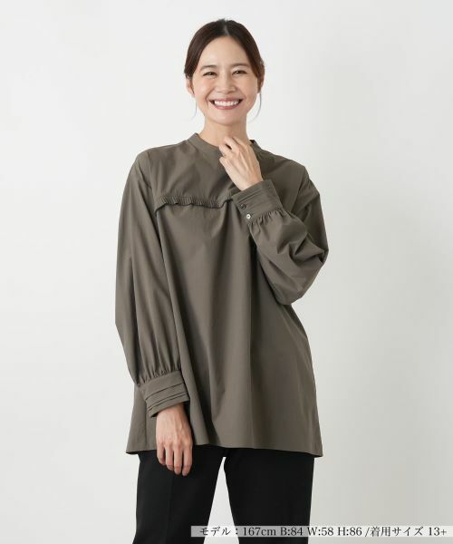 柔らかな素材感が魅力の、スタンドネックプルオーバーブラウスです。胸元にあしらわれた繊細なピンタックフリルが、フェミニンで上品な印象を与えます。袖口にもギャザーとピンタックが施されており、ふんわりとしたボリュームスリーブが女性らしさを引き立てます。ゆったりとした身幅とヒップをカバーする着丈で、体型を気にせずリラックスして着用できる一枚です。シンプルなデザインながら、細部のディテールが光るブラウスは、きれいめカジュアルからオフィススタイルまで、幅広いシーンで活躍します。