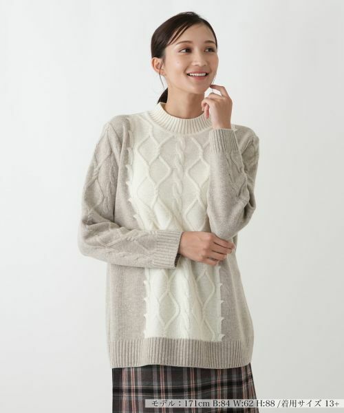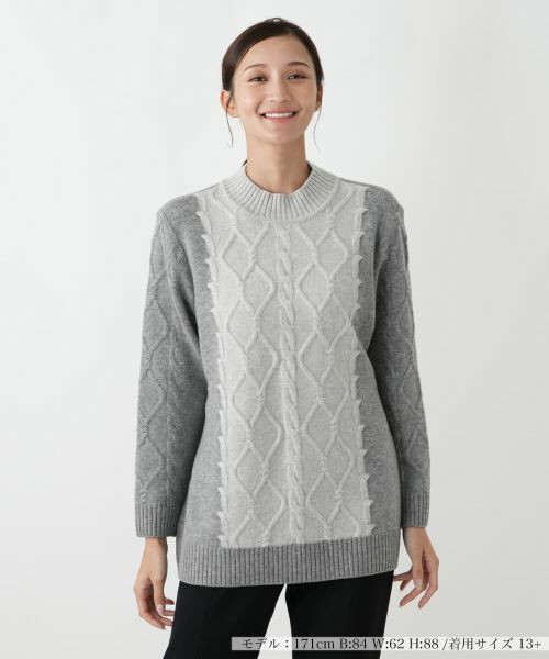 毛100%で仕立てた、暖かく柔らかな肌触りのハイネックセーター。30番手という細番手紡毛糸を使用し、カシミヤ紡績で長年培った配合技術を生かすことで、軽くて膨らみのある糸を作り出しました。ケーブル柄や脇、袖の配色がデザインのポイントとなり、洗練された印象を与えます。ハイネックが首元を優しく包み込み、肌寒い季節も暖かくお過ごしいただけます。一枚で着るだけで様になり、大人の女性のエレガンスを際立たせる特別な一枚です。