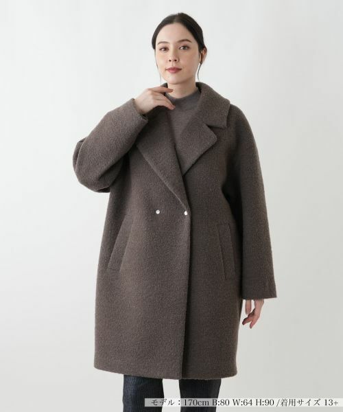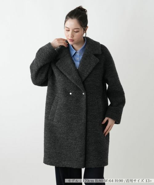 暖かみのあるブークレ素材が特徴の、ミドル丈コートです。ふっくらとした表面感と、テーラードカラーがエレガントな印象を与えます。ゆったりとしたオーバーサイズシルエットは、厚手のニットの上にも羽織りやすく、リラックスした着心地を提供。フロントはダブルブレストデザインで、シンプルなコーディネートにクラシカルなアクセントをプラスします。両サイドには、実用的なポケットが配されており、機能性も兼ね備えています。デイリーユースから、きれいめなスタイルまで、幅広いシーンで活躍する一枚です。