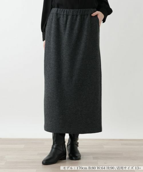毛とナイロンをブレンドした、暖かく柔らかな肌触りの無地タイトスカート。裏地にはポリエステルを使用し、滑らかな穿き心地です。ウエストはゴム入りで、窮屈感なく快適にフィットします。ビジネスシーンはもちろん、普段使いまで、幅広いシーンで活躍する汎用性の高い一枚です。流行に左右されないデザインは、長くご愛用いただけるでしょう。