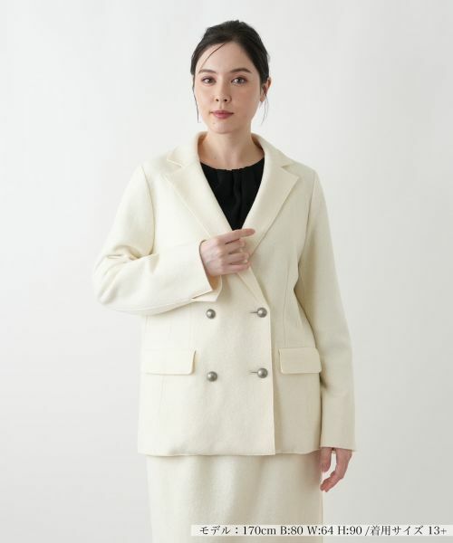 ふっくらとした質感と、暖かみのある素材で仕立てられたダブルブレストジャケットです。テーラードカラーのきちんと感と、ゆったりとしたシルエットが、品の良いリラックス感を演出します。フロントのダブルボタンと、両サイドに配されたフラップポケットが、クラシカルなアクセントに。同素材のスカートと合わせたセットアップスタイルは、セレモニーシーンからビジネスシーンまで、幅広い場面で活躍します。単品でも、デニムなどのカジュアルなアイテムと合わせて、きれいめカジュアルを楽しむことができます。