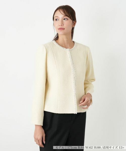 繊細なミックス感のあるツイード素材で仕立てられた、上品なノーカラージャケットです。襟元から前立てにかけて施されたブレード装飾が、デザインに華やかさと洗練された印象をプラスしています。シンプルなクルーネックデザインは、インナーとのコーディネートを楽しめ、どんなトップスとも相性抜群です。コンパクトな丈感と、ボディラインに沿うような美しいシルエットが、女性らしさを引き立てます。セレモニーシーンから、オフィス、カジュアルな装いまで、幅広い場面で活躍するエレガントな一枚です