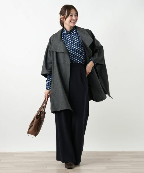 しっとりとした落ち感のある素材で仕立てられた、ケープ型のショートコートです。首元を包み込むようなスタンドカラーは、防寒性も高く、小顔効果も期待できます。フロントのダブルボタンが、クラシカルなアクセントに。ゆったりとした身幅と、裾に向かって広がるAラインシルエットが、体型をカバーしつつ、女性らしい優雅な印象を与えます。インナーに厚手のニットを合わせてももたつかず、快適な着心地。季節の変わり目の羽織りとして、またコーディネートの主役としても活躍する一枚です。