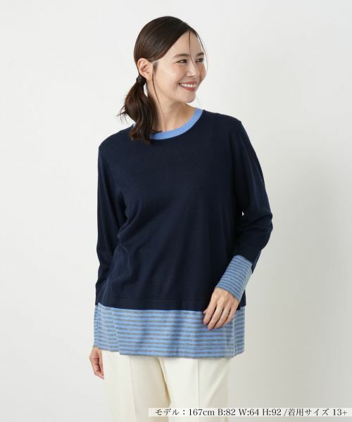 重ね着風のデザインが魅力の、クルーネックプルオーバーです。無地のシンプルなニットに、爽やかな配色のボーダー柄の布帛が裾と袖口から覗くデザインが特徴。裾の布帛部分はサイドにスリットが入っており、軽やかな動きを演出します。首元のリブは、襟元と異なる配色が施され、さりげないアクセントに。一枚でレイヤードスタイルが完成するため、忙しい朝にも重宝します。カジュアルながらも、上品な印象を与えるデザインで、デイリーユースからオフィススタイルまで幅広く活躍します。