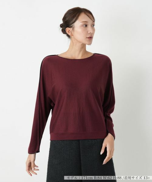 しっとりとした落ち感のある素材が特徴のプルオーバーです。ボートネックとラグランスリーブのシンプルなデザインに、ホワイトのパイピングが施されており、すっきりと洗練された印象を与えます。パイピングが肩から袖にかけて流れるようなラインを強調し、デザインのアクセントになっています。ゆったりとした身幅で、体型カバー効果も期待できます。カジュアルながらも上品さを兼ね備えた一枚で、普段使いからオフィススタイルまで、幅広いシーンで活躍します。