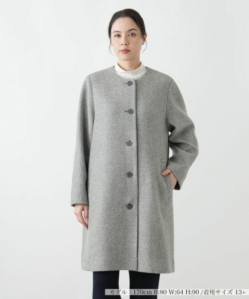 バスケット調の表情豊かな織柄が美しい、上質なコートです。カシミヤをふんだんに使用し、大津毛織の「AirFab」リバー素材で仕立てることで、軽やかさと温かなぬくもりを両立しました。袖部分は緩やかな丸みを帯びたデザインで、腕を通すたびに心地よさが広がり、快適な着心地です。羽織るだけで装いをクラスアップさせる、大人の女性のためのエレガントな一枚です。