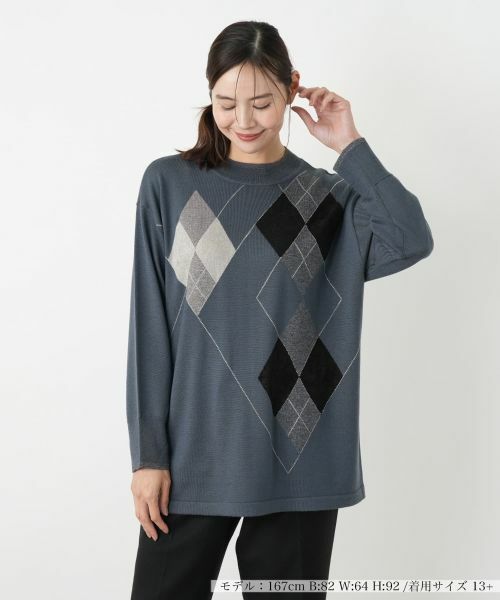上品な肌触りのニット素材で仕立てられた、クルーネックのプルオーバーです。フロントにはクラシックなアーガイル柄が大胆に配され、洗練された印象を与えます。異なる質感の糸で表現された菱形模様は、奥行きと表情豊かな仕上がり。ゆったりとした身幅と、ヒップにかかる丈感で体型カバーも叶えつつ、リラックス感のある着心地を実現します。カジュアルなパンツスタイルはもちろん、きれいめなスカートと合わせても上品に着こなせる、汎用性の高い一枚です。