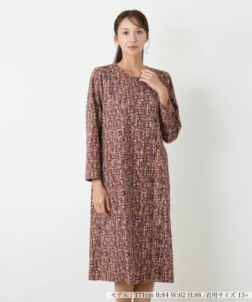 ツイード調のプリントが施された、上品な雰囲気のワンピースです。様々なトーンで表現された複雑な柄は、奥行きと洗練された印象を与え、一枚で着映えするデザインです。シンプルなクルーネックと、ゆったりとしたストレートシルエットが、着心地の良さと体型カバーを両立。膝下丈で上品な印象のため、普段使いはもちろん、ちょっとしたお出かけやセミフォーマルなシーンにも対応します。アクセサリーやアウター次第で、幅広いスタイリングが楽しめます。