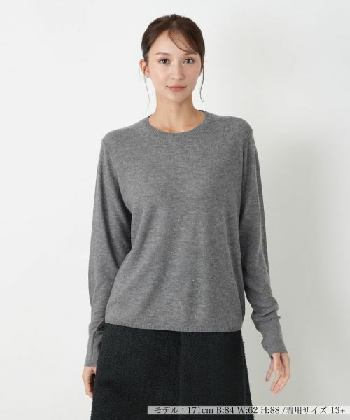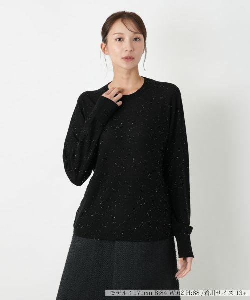 このニットは、ベーシックなクルーネックデザインながらも、全体に散りばめられた小さなスパンコールが、動くたびに繊細なきらめきを放ち、華やかさを添えます。 肌触りの良い薄手のニット素材は、程よいフィット感で快適な着心地を提供。袖口と裾はリブ編みで仕上げられ、すっきりとした印象です。一枚で着ても、インナーとしてレイヤードスタイルを楽しんでも、顔周りを明るく見せ、コーディネートに上品なアクセントを加えます。シンプルなスカートやパンツと合わせるだけで、洗練された大人の着こなしが完成する一枚です。