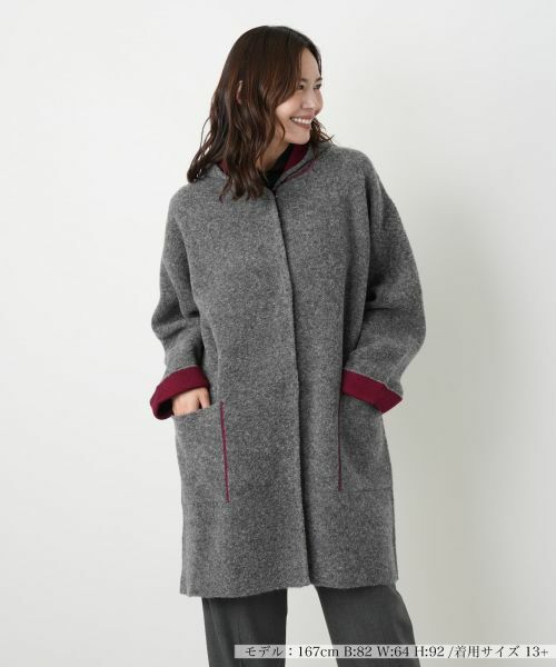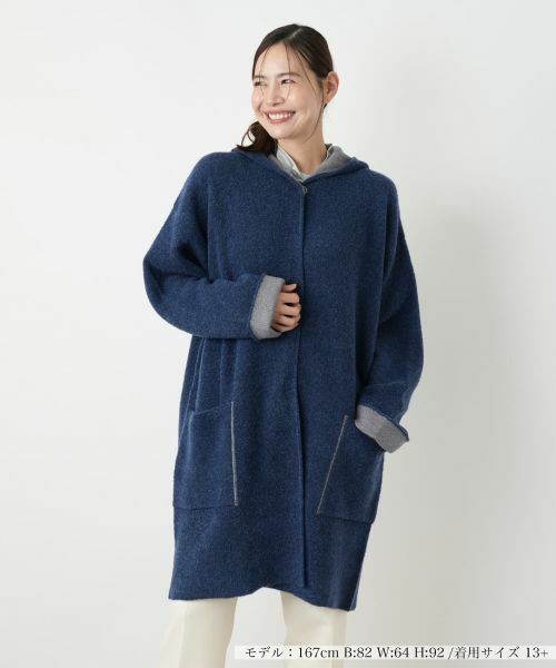 暖かみのあるブークレ素材を使用した、ミドル丈のフーデッドコートです。表面の独特なループ状の毛羽立ちが、柔らかな風合いと豊かな表情を生み出しています。裏地とのバイカラーデザインが特徴で、袖口を折り返したり、フロントを開けて羽織ったりすることで、スタイリングに奥行きを与えます。縁取られたラインステッチがデザインのアクセントとなり、カジュアルながらも洗練された印象。大きめのポケットと、個性的なデザインボタンが、全体の遊び心を高めます。ゆったりとしたシルエットで、中に厚手のニットも着込みやすく、デイリーユースからちょっとしたお出かけまで幅広く活躍する一着です。