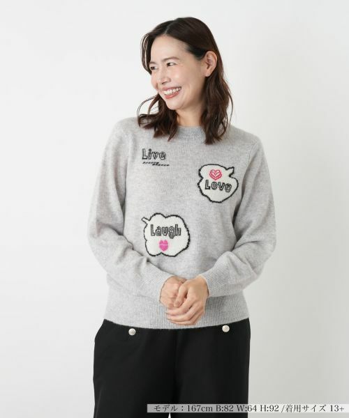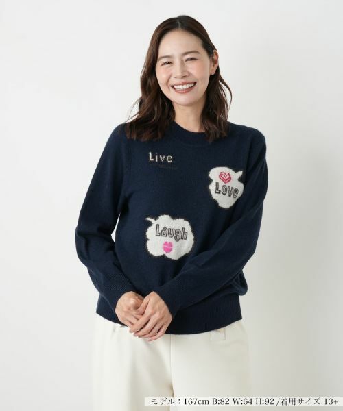 上質なカシミヤをふんだんに使用し、7ゲージでふっくらと柔らかな肌触りに仕上げたインターシャ編みセーターです。吹き出しロゴには「Live(生きて)・Love(愛して)・Laugh(笑って)」、後ろ身頃には「Happy(幸せ)」のポジティブなメッセージを遊び心たっぷりにデザインしました。ベーシックカラーに加え、トレンド色のウィンターレッドも展開し、冬のコーディネートを楽しく彩ります。温かなぬくもりと、心弾むメッセージが込められた特別な一枚です。