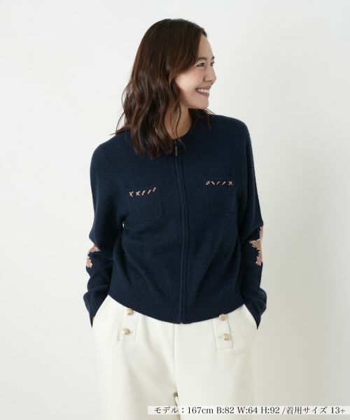 肘部分にあしらわれた星のモチーフや、ランダムに施されたハンドステッチが小粋な遊び心をくすぐるインターシャ編みジャケットです。コンパクトなサイズ感ですっきりと着こなせ、洗練されたキュートな印象を演出します。羽織るだけで、ワンランク上のカジュアルスタイルが完成し、個性を大切にする大人の女性にぴったりの一枚です。