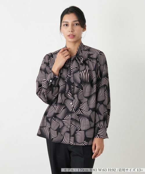 流れるような曲線が織りなす、個性的なプリントが目を引くボウタイブラウスです。とろみのある軽やかな素材感が、ドレープを美しく描き出し、エレガントな雰囲気を演出します。首元にあしらわれたボウタイは、リボン結びにしたり、軽く垂らしたりと、結び方やアレンジ次第で様々な表情を楽しめます。コンパクトな襟と、ボタンで開閉するカフス付きの袖が、きちんとした印象をプラス。一枚で主役になるデザインで、シンプルなボトムスと合わせるだけで、洗練されたコーディネートが完成します。オフィスシーンから華やかなお出かけまで、幅広いシーンで活躍するアイテムです。