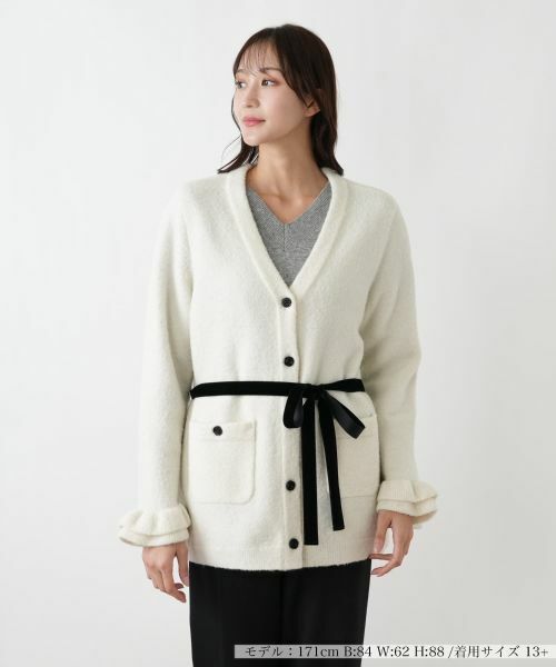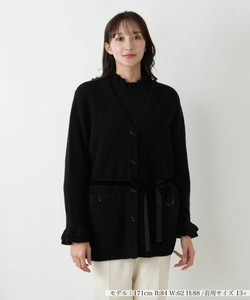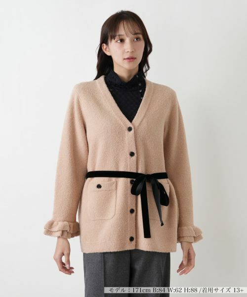 上質な毛をメインに、ナイロンとポリウレタンをブレンドした暖かく柔らかな肌触りのカーディガン。Vネックのノーカラーデザインがデコルテラインをすっきりと見せ、洗練された印象を与えます。共布のベルトが付属しており、ウエストマークすることでスタイルアップも叶い、様々な着こなしをお楽しみいただけます。シンプルな無地デザインは、様々なインナーやボトムスと合わせやすく、着回し力も抜群です。季節の変わり目の羽織りとして、また冬にはアウターの下に重ねるなど、長くご愛用いただけるタイムレスなデザインです。