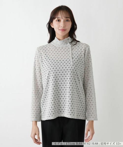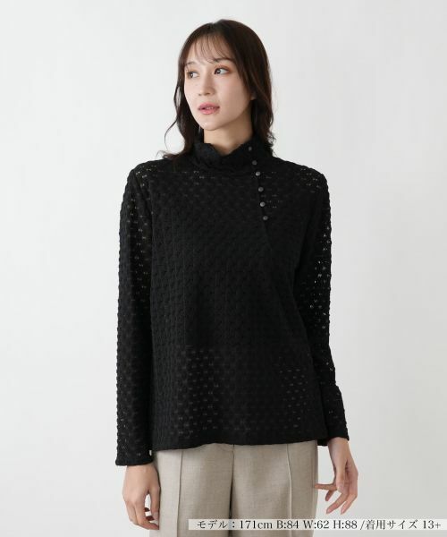 繊細な透かし編みが全体に軽やかな表情を生み出すプルオーバーです。総体に施された規則正しい幾何学的なパターンは、見る角度によって穏やかな陰影と奥行きを演出し、一枚で豊かな表情を纏います。首元は上品にカーブを描き立ち上がるボトルネックで仕立てられており、顔周りをすっきりと見せます。左肩からネックラインにかけては、共生地の包みボタンが縦一列に配置され、視覚的なアクセントとして洗練された印象を与えています。