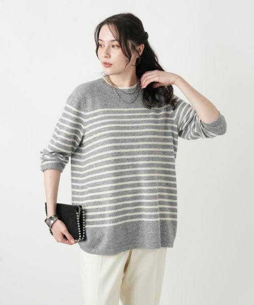 肌触りしなやかなカシミヤを贅沢に使用したセーターです。品の良いボーダー柄は、カジュアルになりすぎず、大人の洗練されたスタイルを演出します。衿元にも配色を施し、さりげないアクセントをプラス。薄手ながら温かなぬくもりで、冬のコーディネートに上品な彩りを添える一枚です。