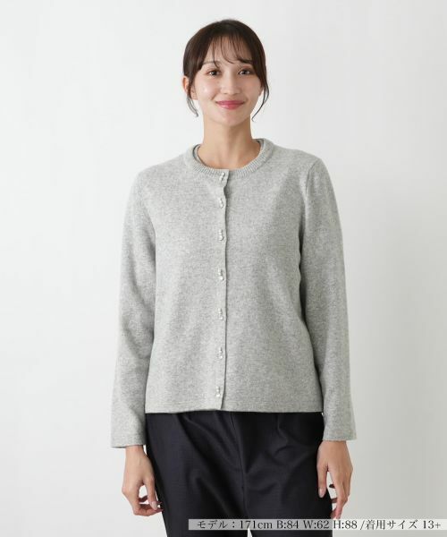 フロントには、真珠のような艶を持つ球体と、その周りを縁取るように輝く小さな石を組み合わせたボタンが縦に並びます。この精巧な作りのボタンは、まるで小さな装飾品のように、編み地の上で上品な輝きを放ちます。前立てに沿って並ぶ光の連なりが、縦の線をすっきりと見せ、装いに華やぎを添えます。