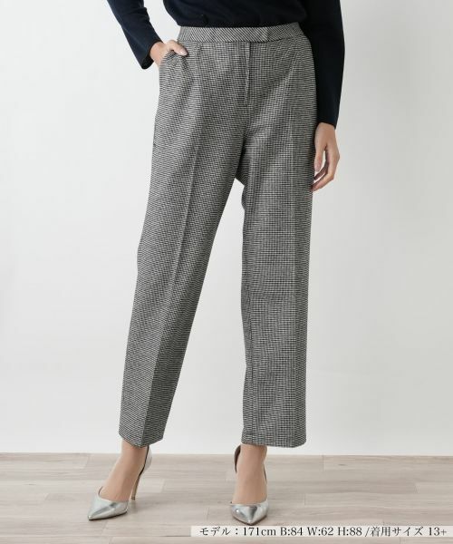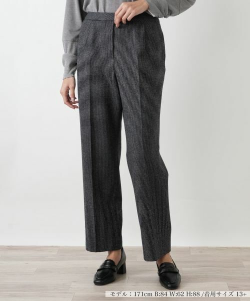 脚の前面中央には、裾までまっすぐに伸びる一本の折り目が付けられています。この縦のラインが、脚の形をすっきりと見せ、端正な立ち姿を作ります。腰から裾にかけて、身体の線に沿いすぎない直線的な仕立てで、足首がわずかに覗く丈の長さが、足元に軽やかさをもたらします。